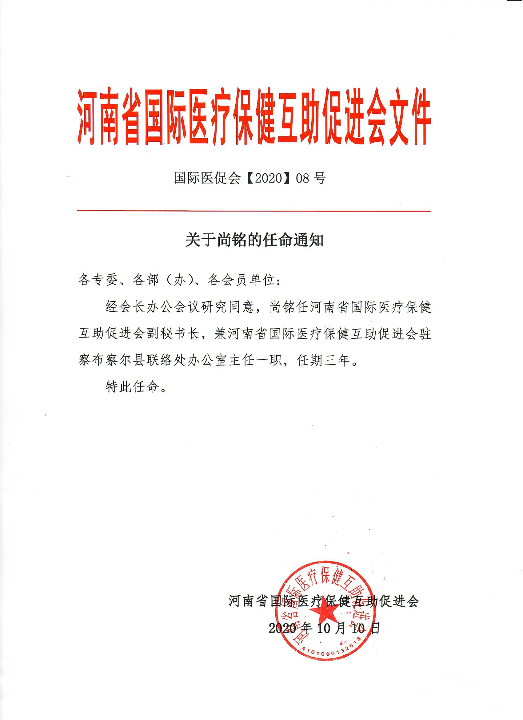 关于尚铭的任职通知