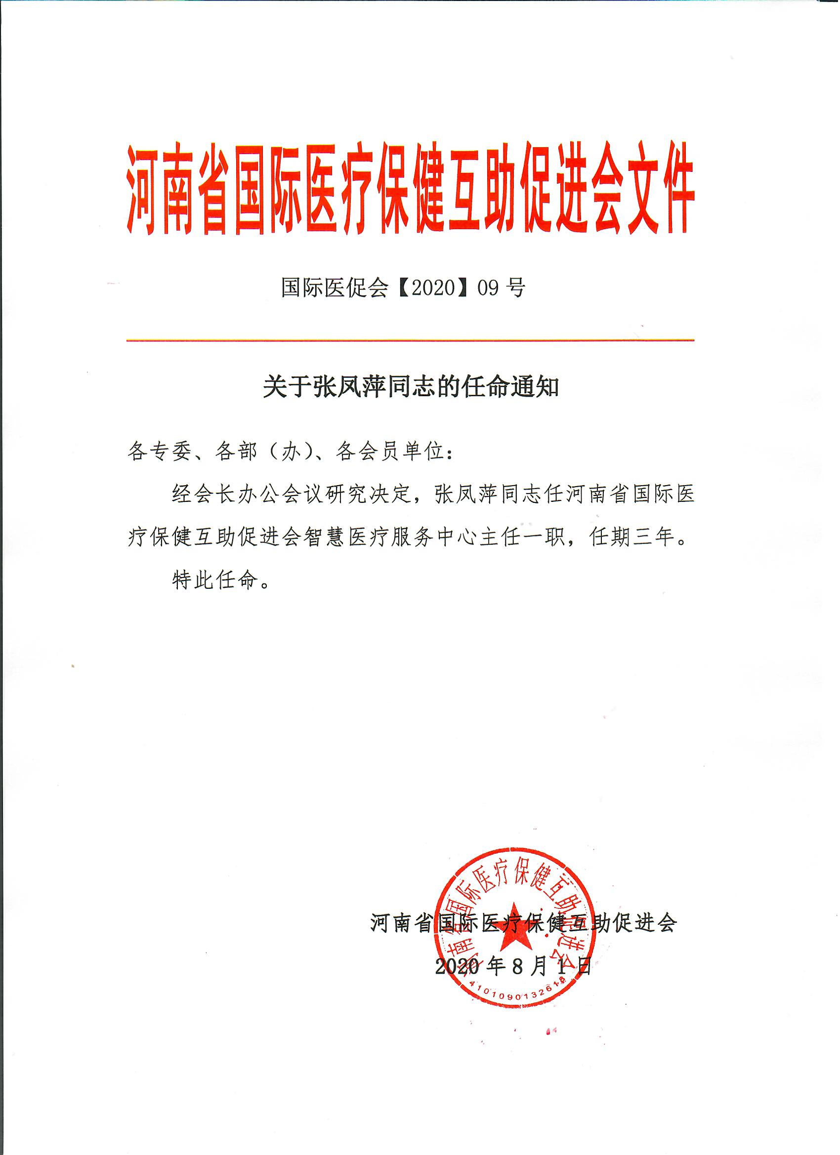 关于张凤萍同志任职的通知