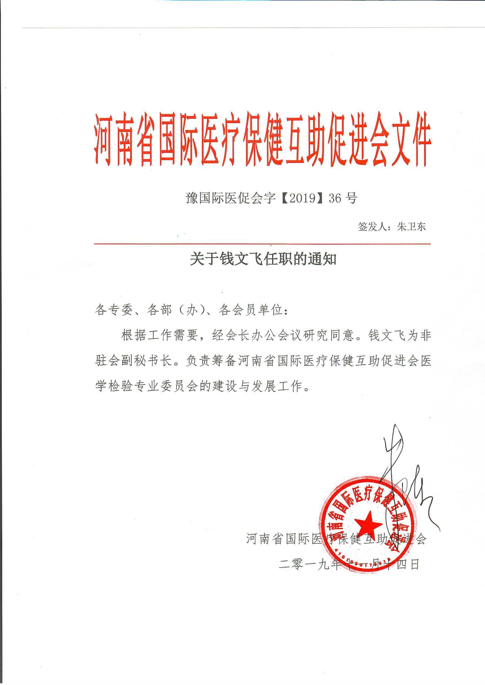 关于钱文飞任职的通知