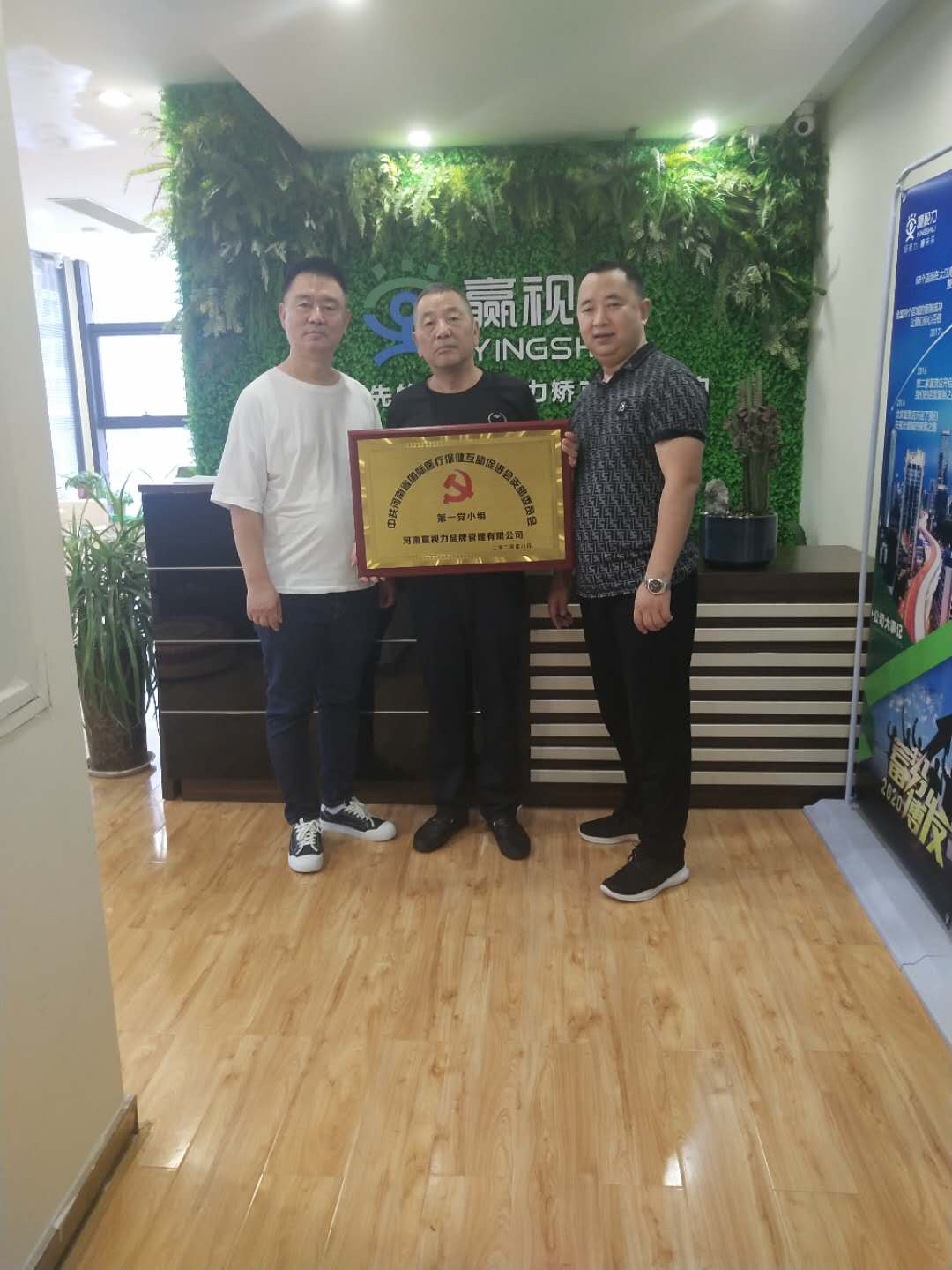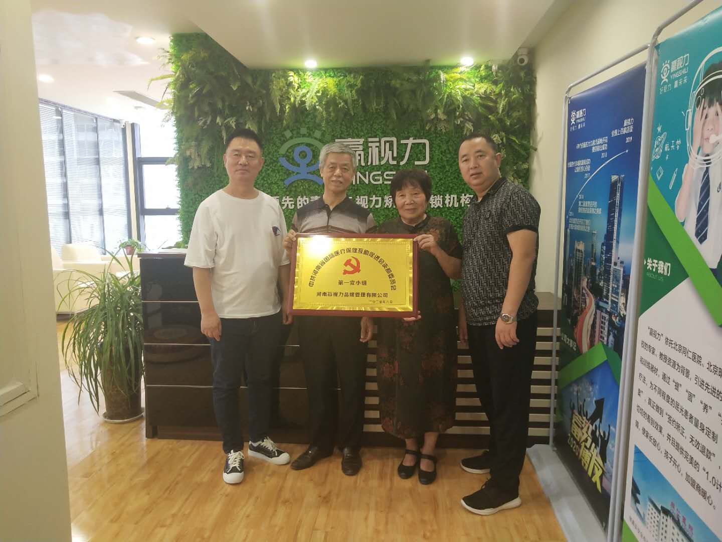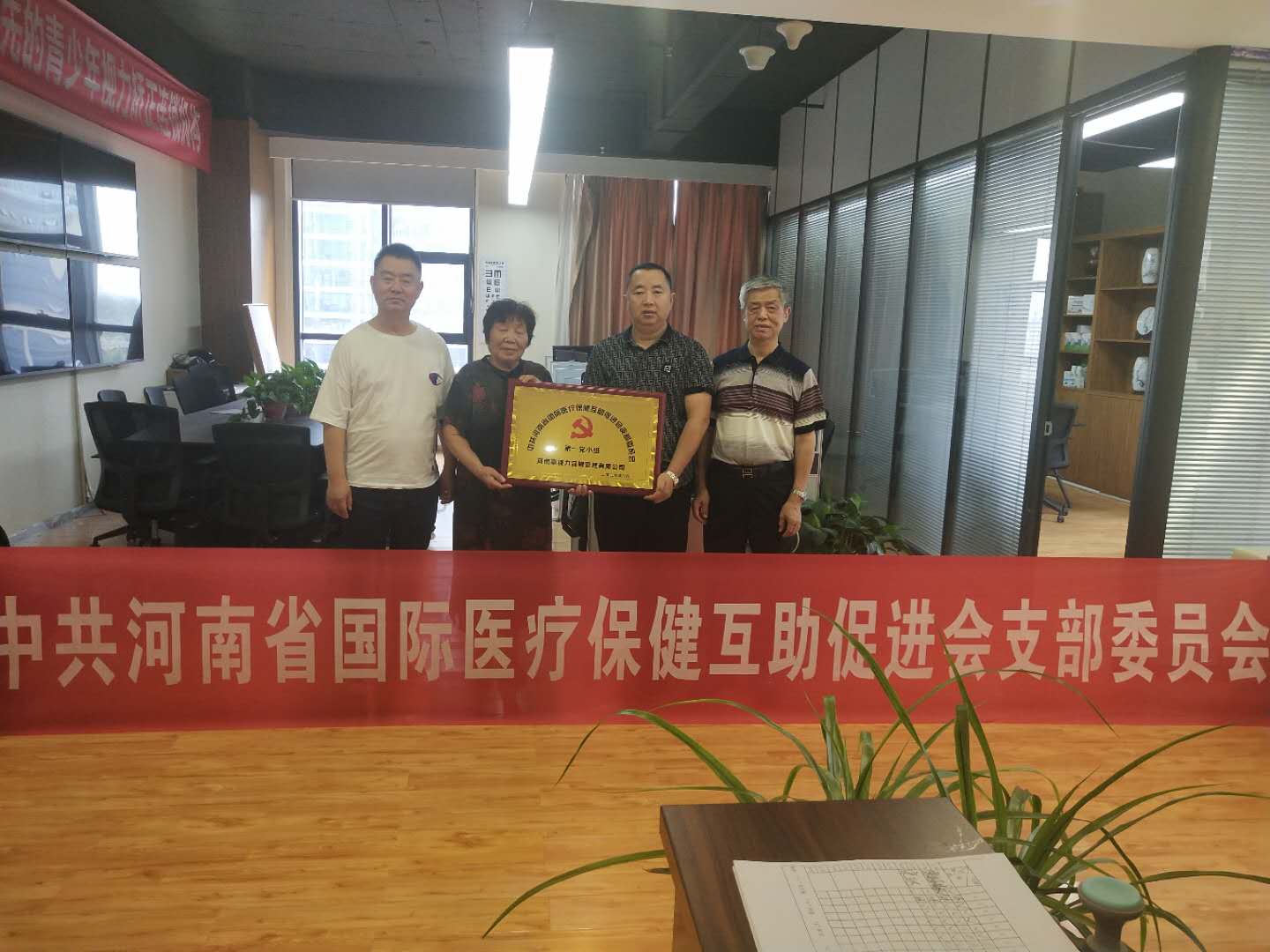 2020年8月14日国际医促会党支部书记刘卫东同志向河南赢视力品牌管理有限公司颁发中共河南省国际医疗保健互助促进会支部委员会第一党小组牌匾。在下一步工作在中,国际医促会党支部和第六党小组将会紧密的结合,定时组织学习党中央的最新指示和建党要求,号召组织全体党员,开展心得交流,不忘初心,牢记使命。密切联系群众,牢记宗旨意识,在经济发展,稳定社会,扶贫脱贫等多方面起到先锋模范带头作用。