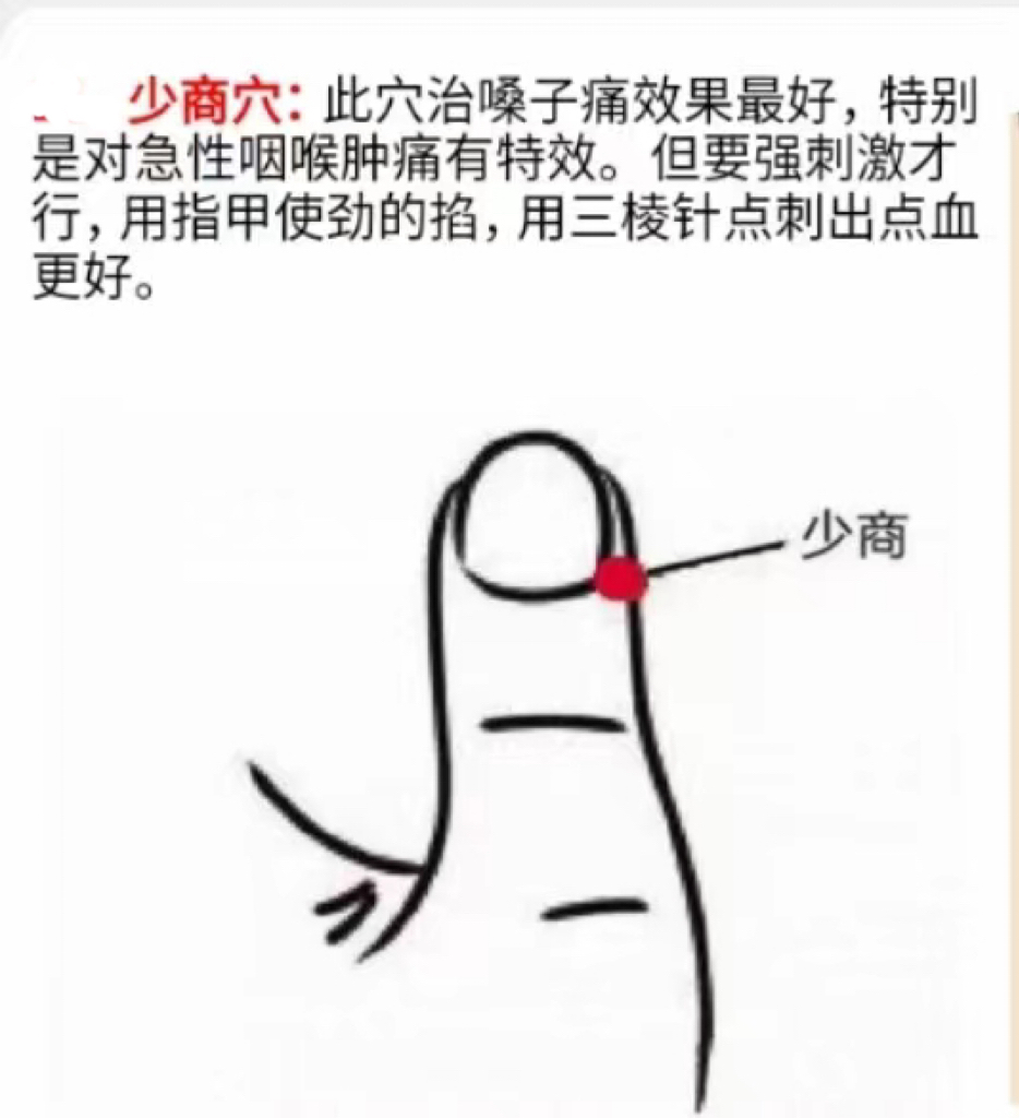 一、【少商穴】此穴治子嗓痛效最果好,特别是急对性咽喉痛肿有特效。但强要刺激才行,用指甲劲使的掐,用三针棱点刺出血点更好。